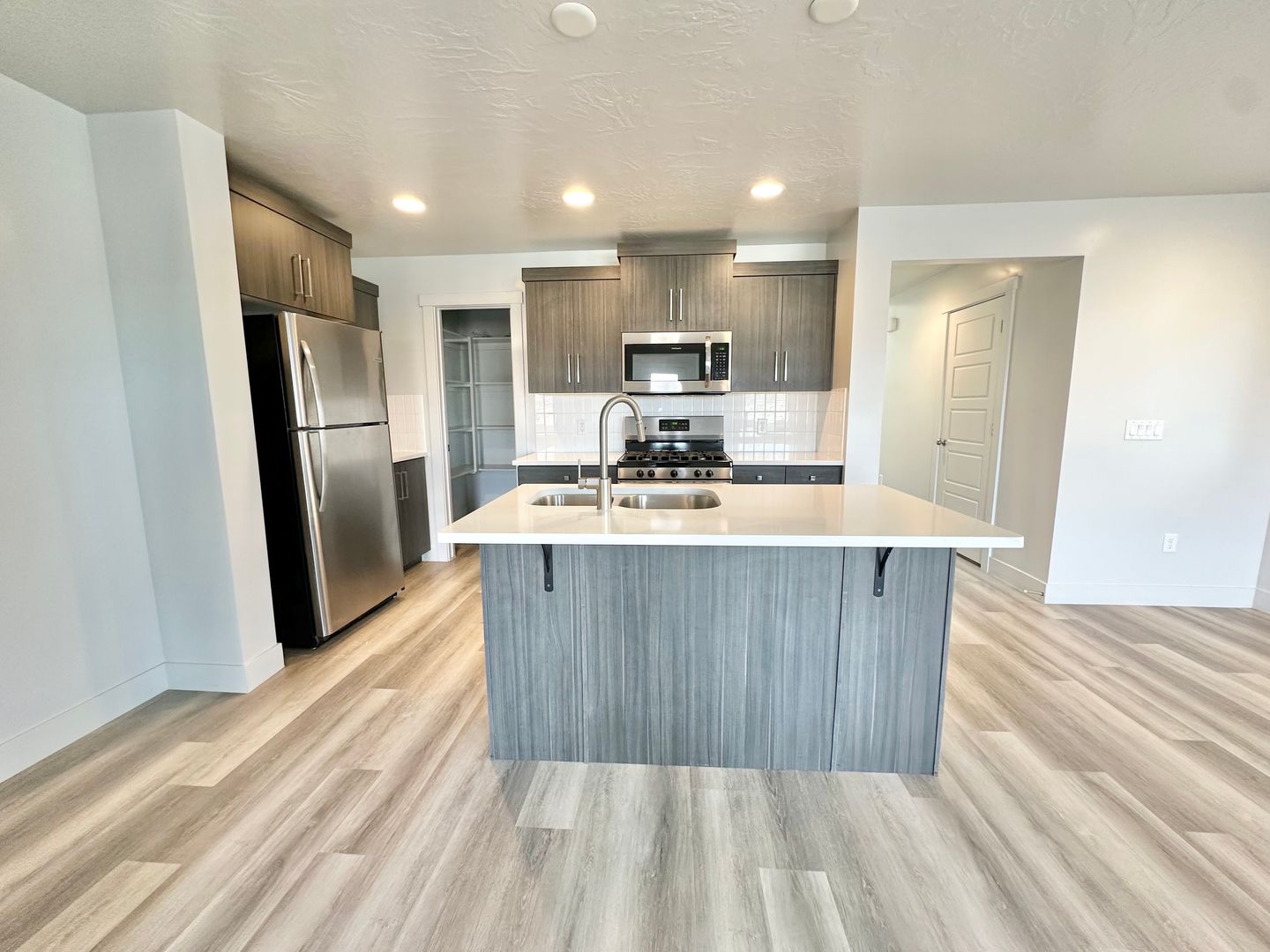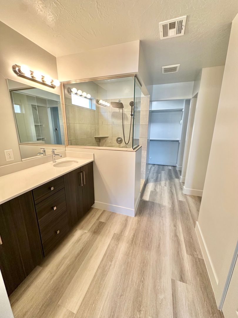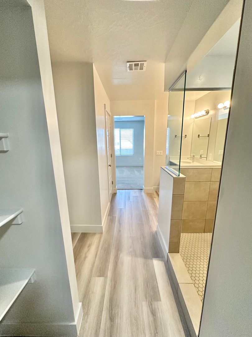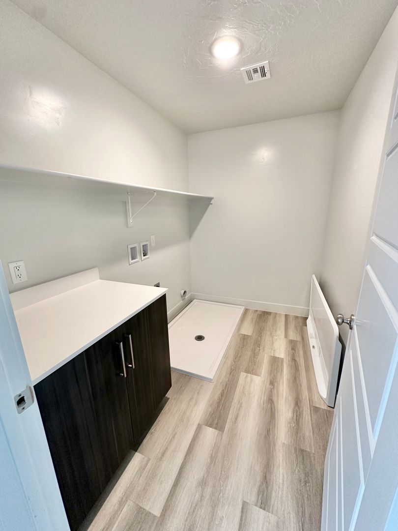 The thoughtfully designed layout features a spacious primary bedroom on the main floor, complete with a luxurious en-suite bathroom that boasts a beautiful double vanity and a generous walk-in closet, equipped with a convenient washer/dryer hookup. The heart of the home is the modern kitchen, outfitted with sleek stainless steel appliances and a stylish bar area, perfect for casual dining and entertaining.
