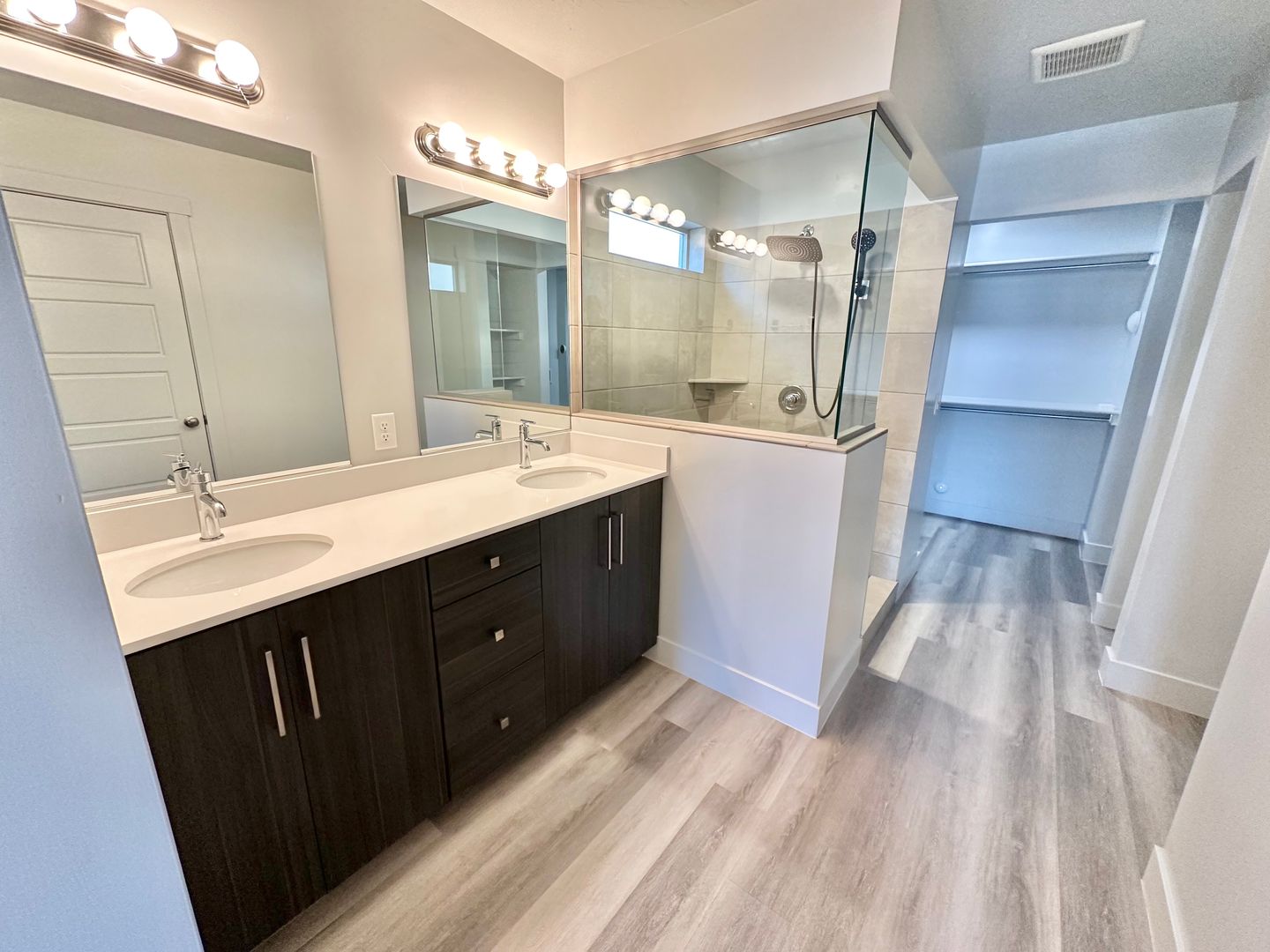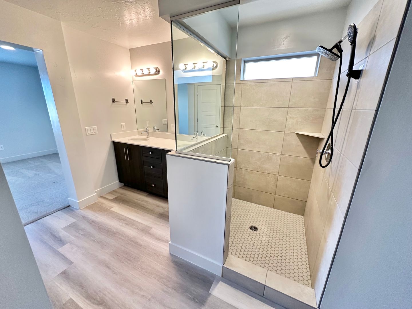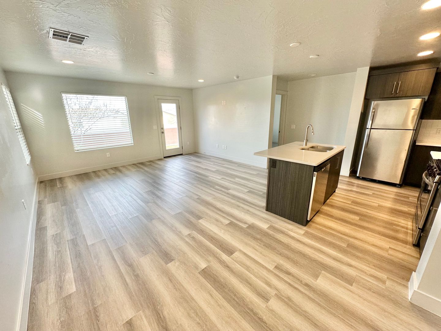 The thoughtfully designed layout features a spacious primary bedroom on the main floor, complete with a luxurious en-suite bathroom that boasts a beautiful double vanity and a generous walk-in closet, equipped with a convenient washer/dryer hookup. The heart of the home is the modern kitchen, outfitted with sleek stainless steel appliances and a stylish bar area, perfect for casual dining and entertaining.